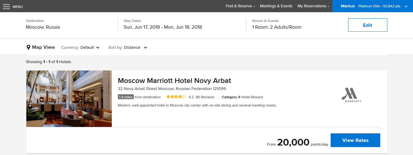 Das Moscow Marriott Hotel Novy Arbat (4,5 *) ist aktuell für nur 20.000 Punkte zu reservieren. Regulär kostet es bei trivago 1.800 EURO die Nacht!