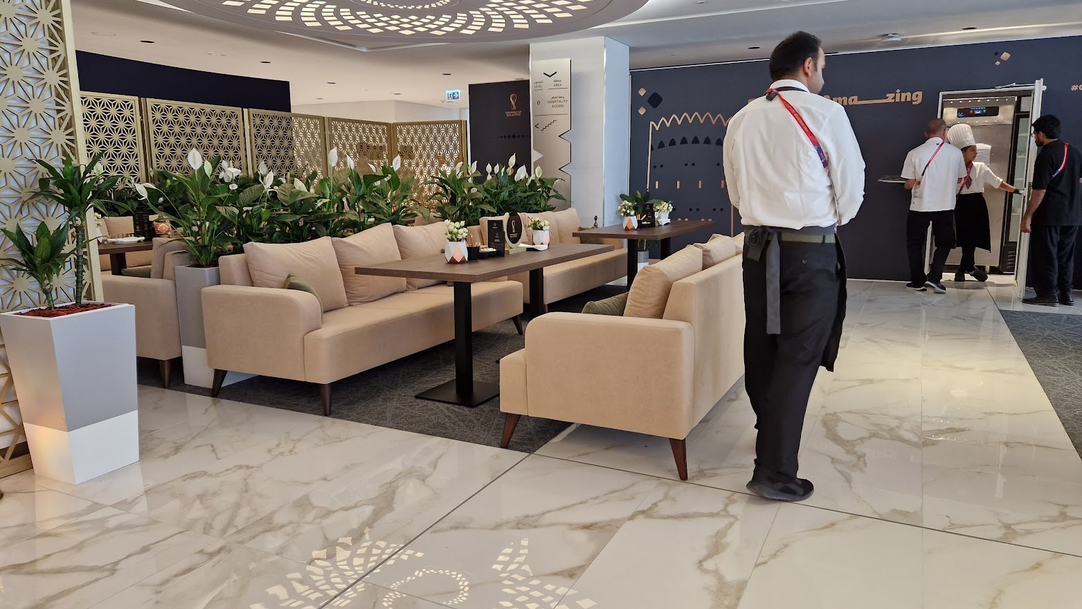 Also beim Japanspiel gute Plätze , volle Lounge , zu laut und Essen war nichts besonderes . Beim Spiel Marokko -Belgien war alles 2 Regale höher . Plätze allererste Sahne mit 1 m Beinfreiheit zum Vordermann , Lounge mit Couch für mich alleine so ruhig wie in der First-lounge der Lufthansa , mit ständigem Pagen für Dynamo und mich allein , der auf Wink geflitzt ist .Auch das Essen da war super , Getränke haben wir mit einem Glas Weiswein begonnen und jeder mit 2 Flaschen Rotwein beendet .Toiletten wie in der First Class.Eine Stunde nach dem Spiel direkt mit dem Taxi von Thumama nach Bayt in knapp einer Stunde zum Deutschlandspiel.