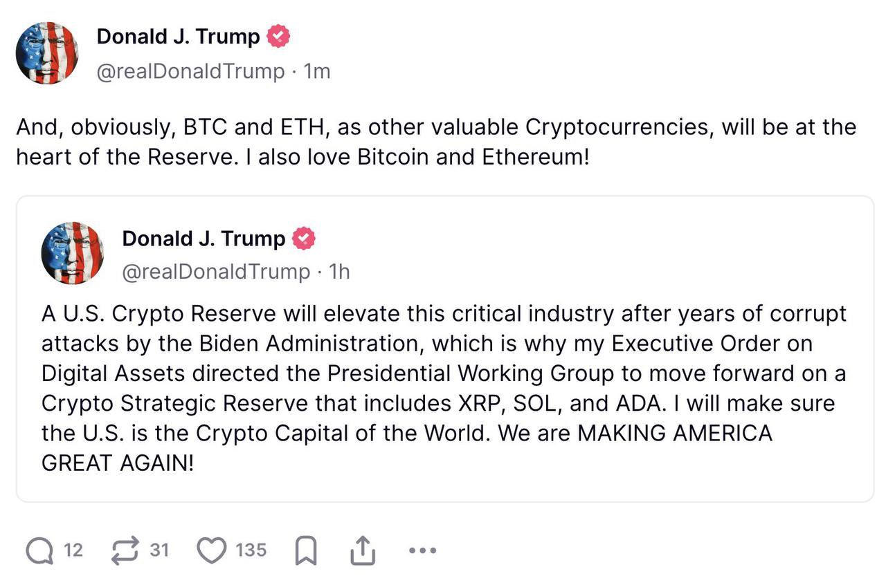 Es gab sehr hartnäckige Gerüchte, dass nur US ansässige Kryptowährungen in die in die Reserve kommen. ETH und BIT sind davon mal ausgenommen, da sie die größten sind und es mehr oder weniger klar war, das die beiden eh rein kommen.