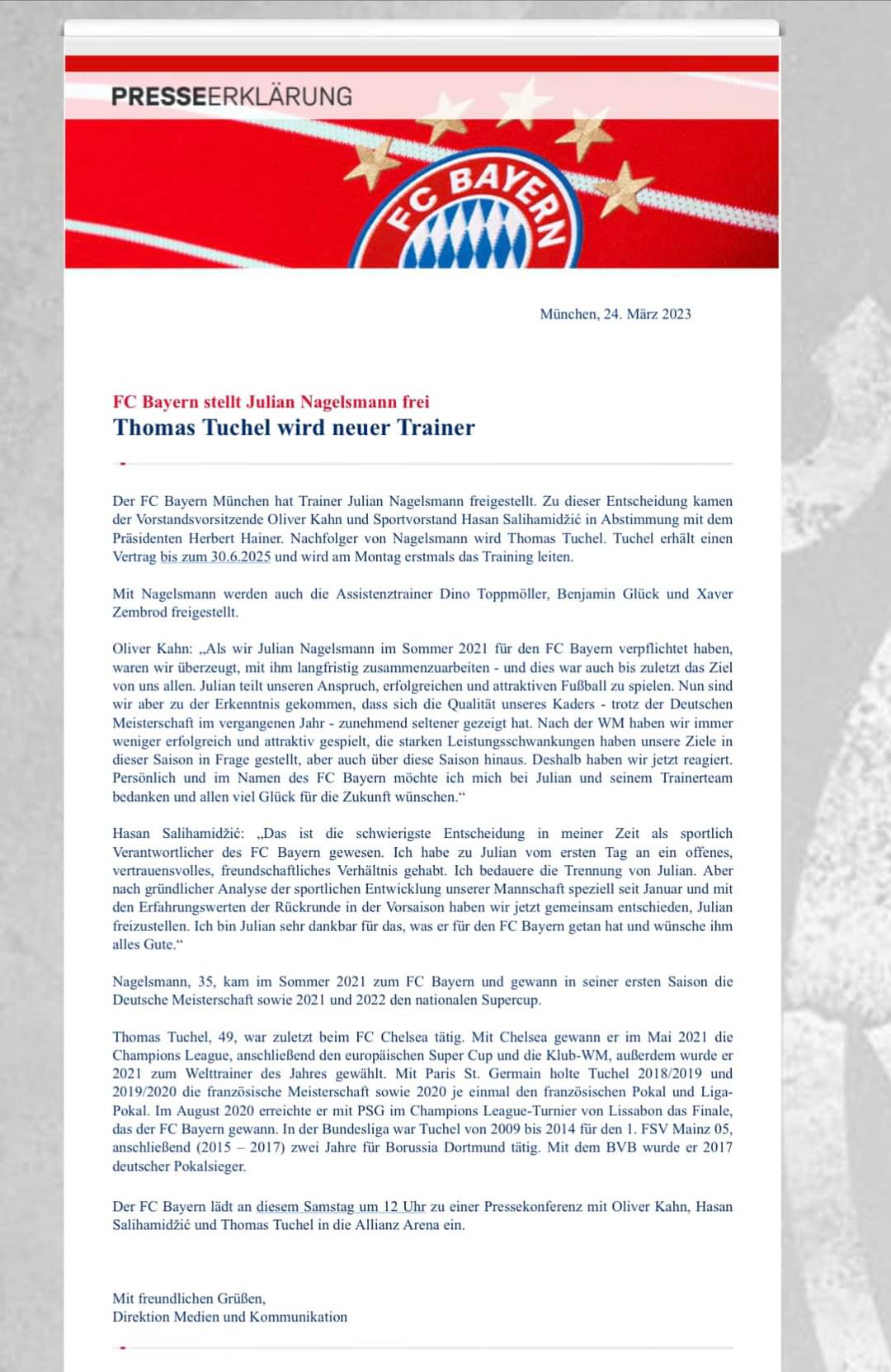 Morgen 12 Uhr Pressekonferenz mit Kahn, Salihamidzic und Tuchel
