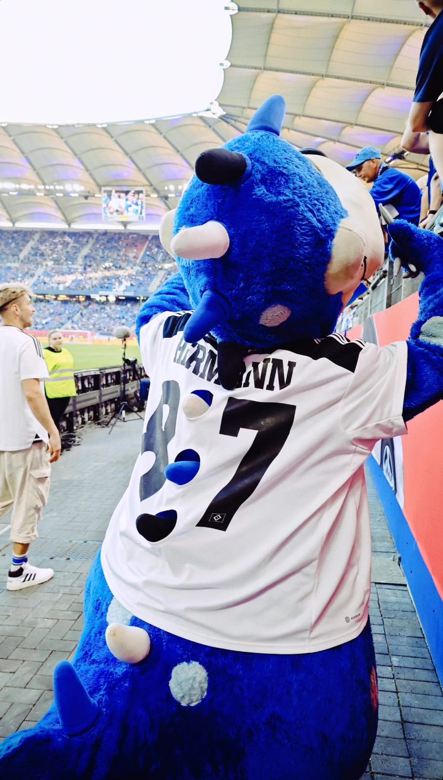 Im Hintergrund sieht man wie Maskottchen Hermann von der Polizei abgeführt wird. Er wollte dem Schiedsrichter an den Kragen.