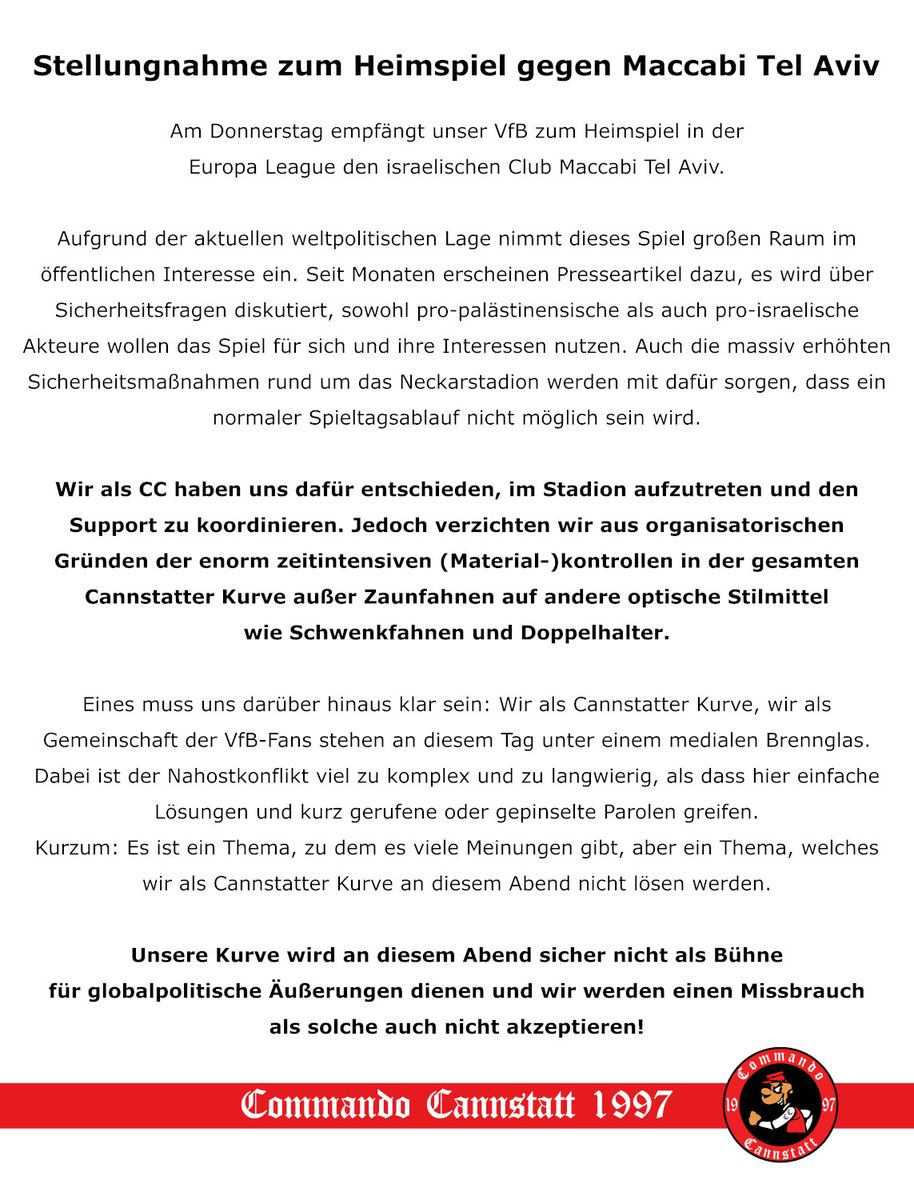 Einige mehr oder weniger wichtige Ultrasgruppen beiben dem EL Heimspiel gegen Maccabi Tel Aviv komplett fern. Das CC97 supportet, aber ohne Material. Es wird also besonders sein morgen.