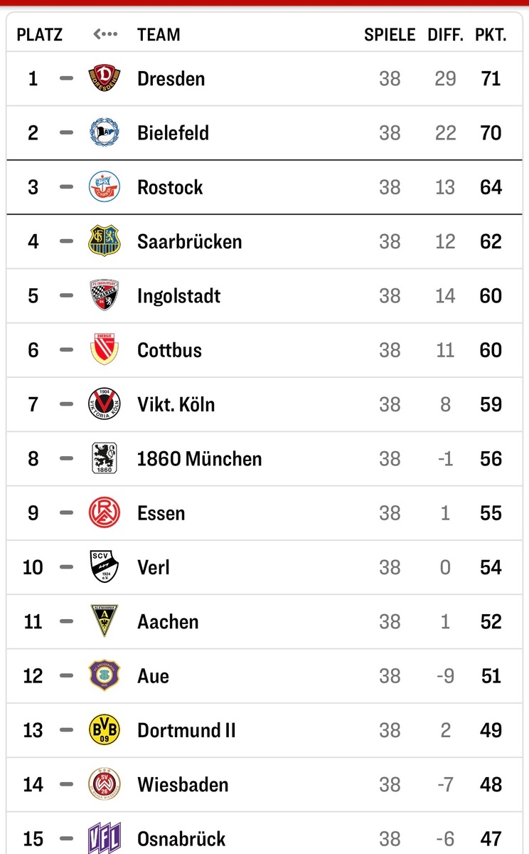 Da spielen noch soviele da oben zumindest um Platz 3 mit, das sind nicht nur Saarbrücken, Cottbus und Hansa. Auch Ingolstadt und Köln sind da noch in der Verlosung. Und mit den Spielen gegen Dynamo und Arminia gibt es da noch etliche Spiele der Genannten gegeneinander.