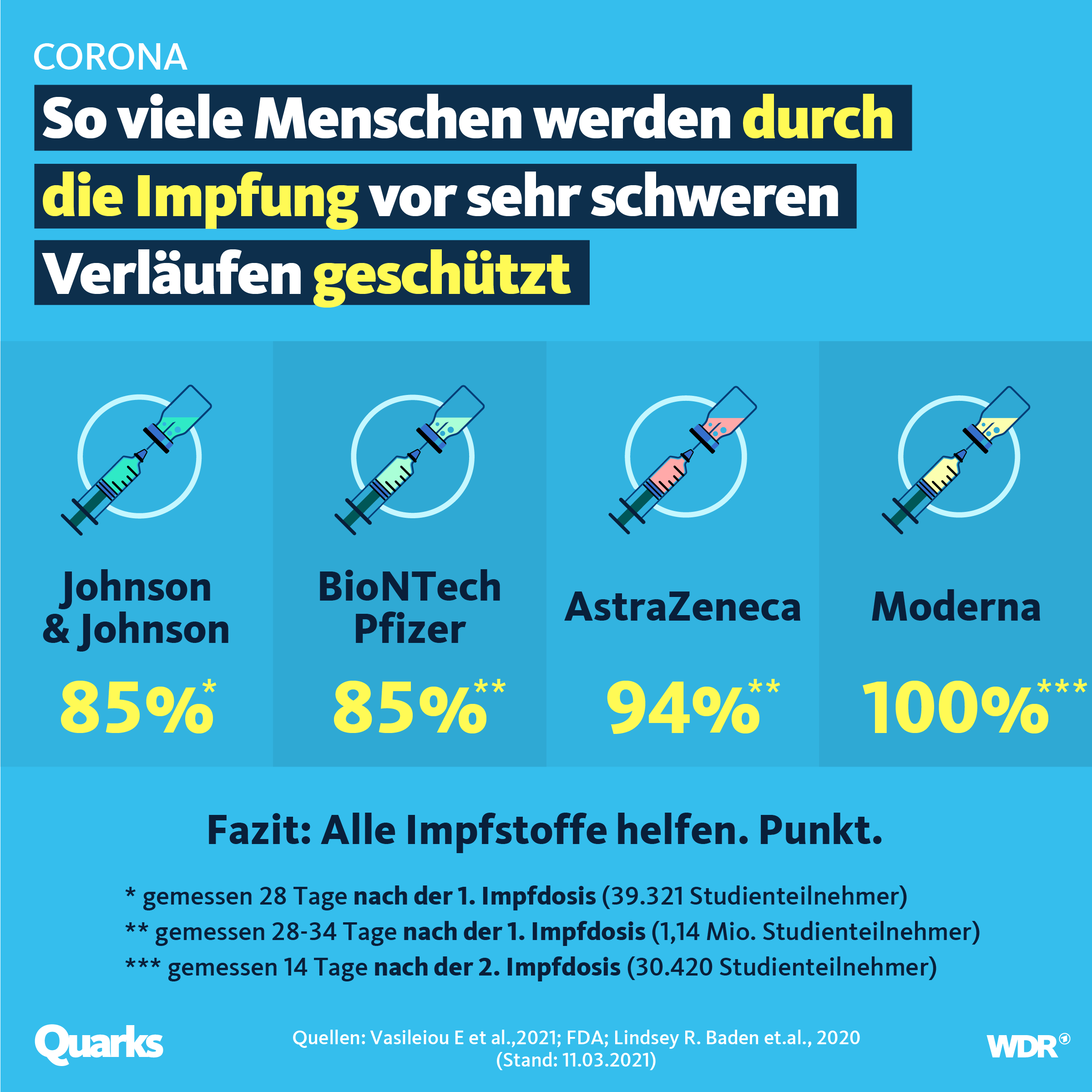 Also wenn ich die Wahl habe zwischen 50-70% Schutz vor leichten Symptomen und dafür in 6 Wochen wieder alle Freiheiten gegenüber 80-90% Schutz vor leichten Symptomen und dafür erst in 14 Wochen wieder alle Freiheiten, würde meine ganz persönliche Entscheidung da eindeutig ausfallen, solange der Schutz vor einer schweren Erkrankung unverändert hoch ist. Aber das muss natürlich jeder für sich entscheiden.