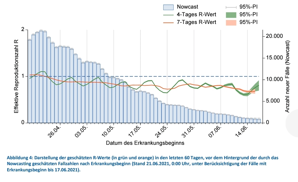 nachdem das RKI am Samstag keinen Bericht zur Verfügung stellen und gestern keinen R Wert berechnen konnte haben sie es heute wieder geschafft. Das 7 Tage R liegt bei 0,68. R ist jetzt seit 2 Monaten dauerhaft unter eins. Die Bundesnotbremse oder vielleicht die Saisonalität wirkt.