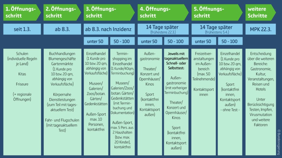 Wie berichtet, wollen Bund und Länder nach längerem Streit regionale Lockerungen schon ab einer Inzidenz von 50 möglich machen. Wie ntv aus Teilnehmerkreisen erfuhr, soll es etwa landesweit oder regional eine schrittweise Öffnung des Einzelhandels geben, wenn die Zahl der Infektionen unter 50 je 100.000 Einwohner in sieben Tagen liegt. Die geeinte Formulierung sieht landesweite oder regionale Öffnungen "des Einzelhandels mit einer Begrenzung von einer Kundin oder einem Kunden pro 10 Quadratmeter für die ersten 800 Quadratmeter Verkaufsfläche und einem weiteren für jede weiteren 20 Quadratmeter" vor. Möglich wären dann auch die Öffnung von Museen, Galerien, Gedenkstätten, zoologischen und botanischen Gärten sowie auch kontaktfreier Sport in kleinen Gruppen bis maximal zehn Personen im Außenbereich, auch auf Außensportanlagen, heißt es weiter in dem Papier.