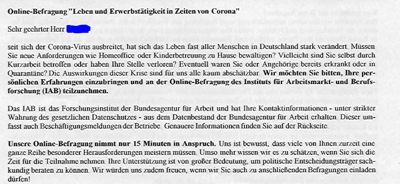 Hab einen Brief mit Einladung zur Online-Befragung "Leben und Erwerbstätigkeit in Zeiten von Corona" bekommen, siehe Screenshot.