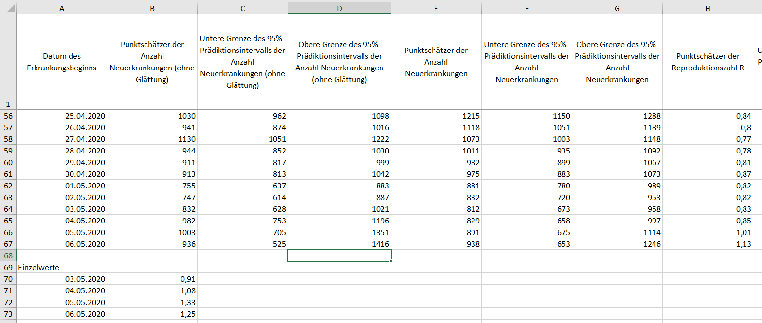 Z.B. sieht man für den vorletzten Wert R=1,01 statt der vorgestern genannten 1,10 und man findet vermutlich aus dem gleichen Grund auch den in der Vorwoche kommunizierten Tiefstwert von 0,65 nicht wieder.