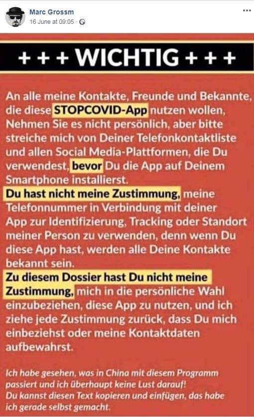 Die Zustimmung zur App ist ja sehr hoch. Aber natürlich gibt es auch Leute, die das anders sehen. Die gibt es ja zu jedem Thema. In der Mehrheit sind sie nicht und so was auf Facebook (!) zu posten ist natürlich die Bergspitze der Trotteligkeit.