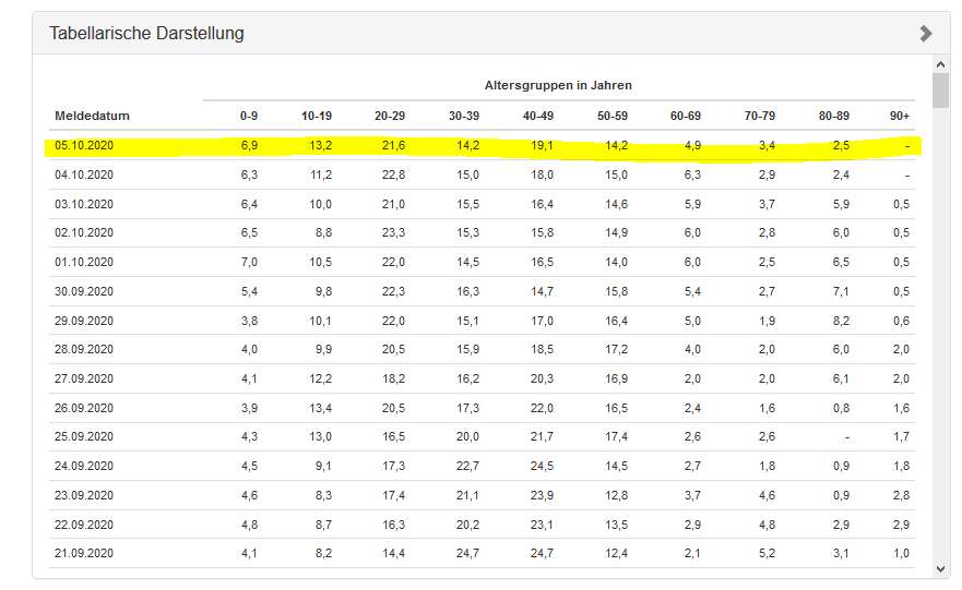 Hier z.B. die Aufteilung der gut 200 Fälle lt. 7 Tage Inzidenz für Duisburg auf Fälle pro 100.000 pro Altersklasse