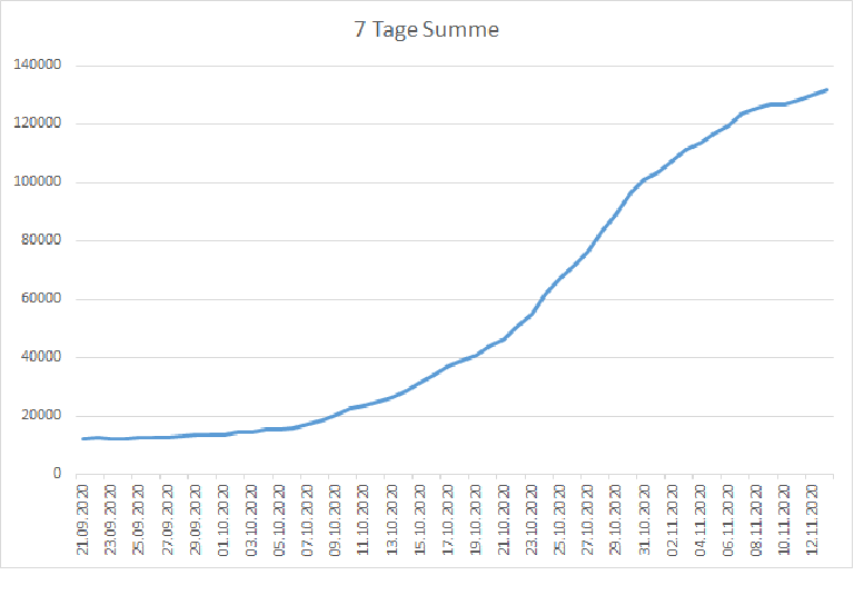 Ich füge dem Beitrag mal noch zwei Grafiken an. Die eine zeigt die Entwicklung der Summe gemeldeter Neuinfektionen über die letzten 7 Tage. Hier ist schon eine deutliche Abflachung zu erkennen. Wie sehr die Dynamik bereits gebrochen wurde, wird in der erwarteten Anzahl gemeldeter Neuinfektionen zu Weihnachten (berechnet basierend auf dem aktuellen 7-Tage Wachstum) noch viel deutlicher. Ich habe hier am Tag mit dem höchsten Wachstum vor ziemlich genau einem Monat angesetzt.