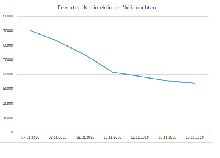 Ich füge dem Beitrag mal noch zwei Grafiken an. Die eine zeigt die Entwicklung der Summe gemeldeter Neuinfektionen über die letzten 7 Tage. Hier ist schon eine deutliche Abflachung zu erkennen. Wie sehr die Dynamik bereits gebrochen wurde, wird in der erwarteten Anzahl gemeldeter Neuinfektionen zu Weihnachten (berechnet basierend auf dem aktuellen 7-Tage Wachstum) noch viel deutlicher. Ich habe hier am Tag mit dem höchsten Wachstum vor ziemlich genau einem Monat angesetzt.