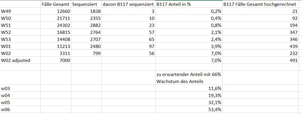 Es sieht zwar in der letzten Woche so aus, als wenn die absolute B117 Zahl in Woche 2 auch gesunken ist (56 Fälle statt 97 Fälle in Woche 1), aber im Link oben steht, dass Woche 2 noch unvollständig ist. Wenn ich B117 mit den entsprechenden Prozentwerten und den Gesamtfällen hochrechne und berücksichtige, dass in Woche 2 ca. 3000 Fälle fehlen, dann würde B117 immer noch steigen, obwohl die Gesamtzahl aktuell stark sinkt (s. meine kleine Kalkulation).