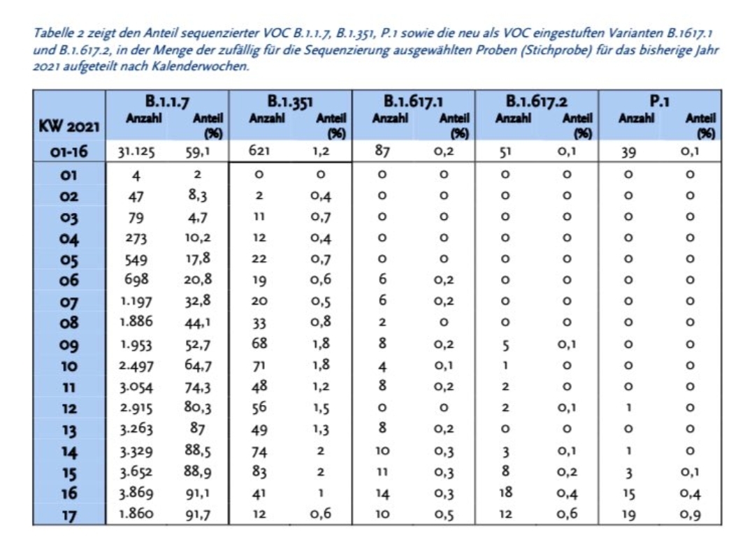 heute Abend geht es bei Lanz u.a. um Mutationen. Zu dem Zweck hier einmal die Zahlen aus dem neuesten VoC Bericht des RKI