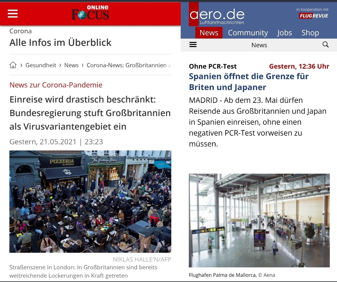 hmmh. Wir wollten ja eigentlich nach dem Finale 2 Wochen Urlaub in England bzw Schottland anhängen. Auf Grund der deutlich niedrigeren Inzidenz in UK halte ich das nach wie vor für eine gute Idee, eigentlich. Nun überlegen wir, dass wir natürlich auch nach dem Finale von London aus für 2 Wochen nach Spanien fliegen könnten, quasi dem obigen Bild folgend. Inzidenztechnisch natürlich völlig beknackt, aber die Bundesregierung will das ja so.