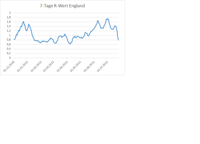Datenupdate England: Bei den Neuinfektionen nimmt die Umkehr der Entwicklung nun Formen an. Der 7-Tage R-Wert ist den achten Tag hintereinander geringer als am Vortag, inzwischen bei 0,78 und damit deutlich unter 1 (Grafik 1). Das Wachstum bei den Einweisungen in die Krankenhäuser ist von zwischenzeitlich +57% auf aktuell etwa +27% zurückgegangen (Grafik 2). Die neuesten Daten sind hier vom 20.7., es ist möglich, dass der Wert nochmal kurzzeitig ansteigen wird, weil es um den 20.7. nochmal einen stärkeren Anstieg der Neuinfektionen gab, das würde sich in etwa einer Woche in den Daten zeigen, anschließend sollte aber auch dort der Trend deutlich nach unten zeigen und die Zahl der Neueinweisungen gegenüber der Vorwoche sinken. Ich gehe davon aus, dass es auf maximal etwa 7500 Neueinweisungen pro Woche in der Spitze hinausläuft, das sind etwa 75% weniger als zur Spitze im Januar (Grafik 3). Gleichzeitig lagen die Neuinfektionen mit 325000 pro Woche nur etwa 25% unter dem Spitzenwert im Januar von 420000 pro Woche. Hier wird deutlich, dass bei gleicher Anzahl an Neuinfektionen erheblich weniger Menschen in den Krankenhäusern landen. Das ist natürlich auf die Impfungen, insbesondere in den älteren Bevölkerungsgruppen, zurückzuführen. Gleiches zeigt sich auch in den Einweisungen pro Neuinfektion (Grafik 5). Während im Frühjahr rund 10% der Infizierten ins Krankenhaus mussten, ist diese Rate seit Mitte März auf inzwischen etwa 2% gesunken. Grafik 6 zeigt das Wachstum der Neuinfektionen (orange) und das Wachstum der Krankenhauseinweisungen (blau). Da die Krankenhausaufnahmen nach Meldedatum natürlich nachgelagert sind, muss die blaue Kurve um etwa 5-10 Tage nach vorne verschoben werden, um beides ins Verhältnis zu setzen. Vergleicht man nun das Wachstum der Krankenhauseinweisungen mit dem Wachstum der Neuinfektionen 7 Tage vorher, zeigt sich, dass nicht nur konstant pro Infektionen weniger Fälle eingewiesen werden, sondern auch die Krankenhauseinweisungen selbst auf diesem niedrigen Niveau noch langsamer wachsen als die Neuinfektionen. Das sind beides wirklich sehr gute Zeichen und zeigen die Wirksamkeit der Impfung. Inzidenz in UK aktuell bei knapp 400 (nach zwischenzeitlich etwa 500).