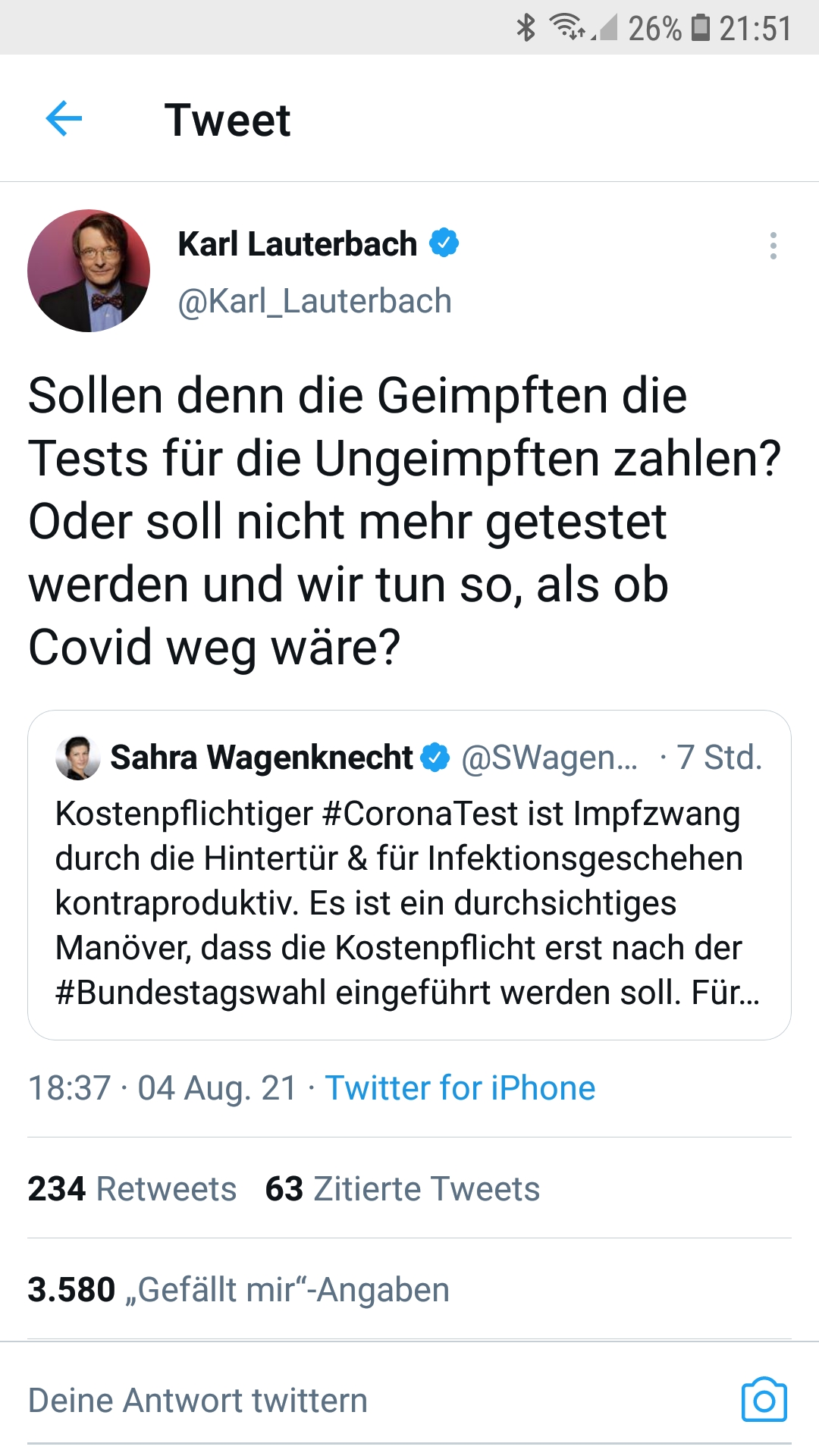 https://www.t-online.de/nachrichten/de…impression=trueam 14.7. sagt Karl Lauterbach, dass er gegen kostenpflichtige Tests für Ungeimpfte ist, weil das eine Impfpflicht durch die Hintertür bedeutet. Heute sagt Sarah Wagenknecht genau das selbe und wird dafür von Lauterbach kritisiert.