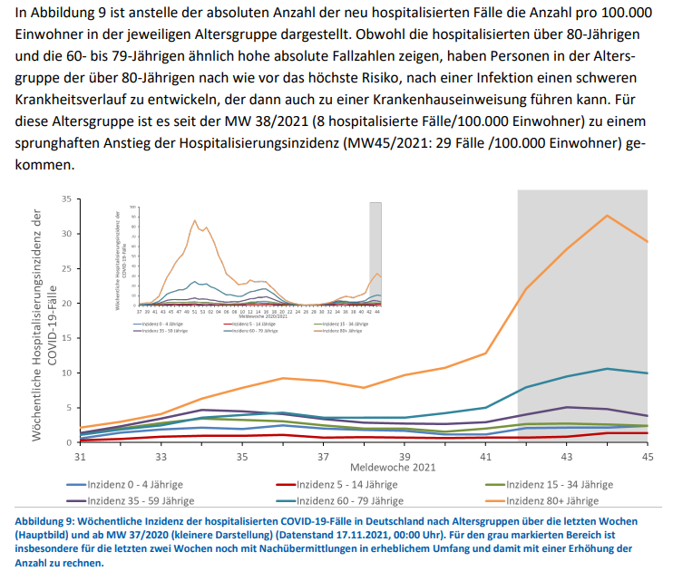Statt sich an Kindern, Jugendlichen und Fußballprofis abzuarbeiten könnte man sich auch mal den Risikogruppen widmen. Die neuen Maßnahmen orientieren sich m.W. an der sog. Hospitalisierungsinzidenz. Es gibt wohl die Stufen 3, 6 und 9. Freundlicherweise stellt uns das RKI diese nach Altersgruppen zur Verfügung. Was wir sehen ist, dass diese bei den unter 35jährigen ganz deutlich unter 3 ist. Bei 35-59 knapp drüber. Bei 60-79 und speziell 80+ spielt die Musik. Wenn dann brauchen wir hier eine Impfpflicht und wenn dann sollten die mMn mal mit dem Hintern zu Hause bleiben. Mir ist natürlich völlig klar, dass viele davon krankheits- oder altersbedingt eh zu Hause bleiben. Von daher ist mindestens eine engmaschige Testpflicht für die Pflege geboten (und meinetwegen berufsbezogene Impfpflicht, wenn die am Ende nicht viele dazu bringt, sich was anderes zu suchen, weil wir es natürlich nicht hinkriegen, die besser zu bezahlen und die Arbeitsbedingungen zu verbessern).