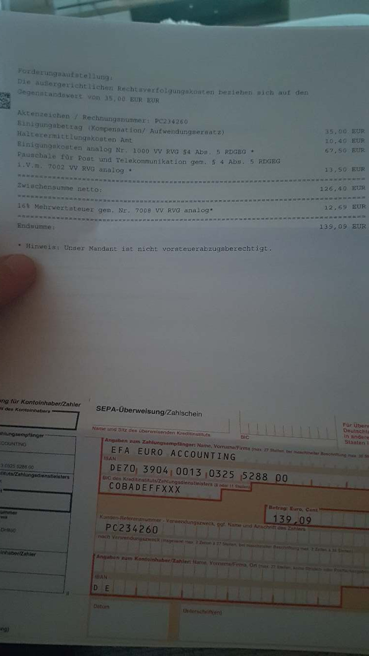 Weiß jetzt nicht genau wie ich weiter vorgehen soll. Rechtsschutz ist vorhanden allerdings mit 150€ Selbstbeteilung, deshalb erstmal hier die Frage in die Runde ob jemand eine Lösung parat hat. Hab eigentlich keine Ambitionen diesen Penner 140€ in den Rachen zu werfen.