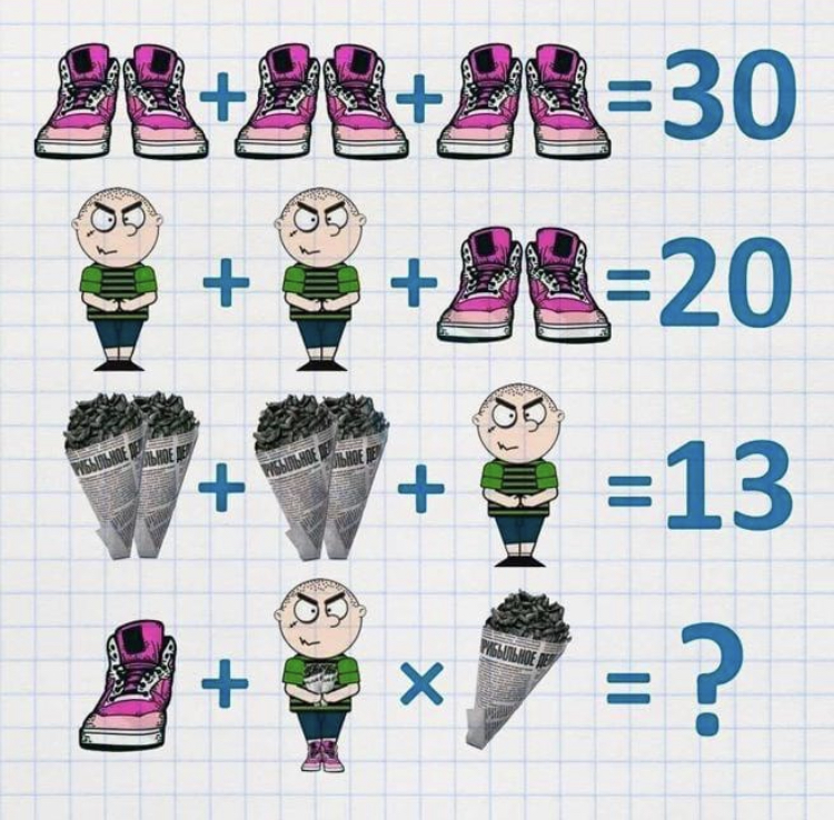Der Typ (5) in der letzten Zeile vom LGS hat rosa Schuhe (10) und zwei Tüten (2*4). Davon ausgehend dass das alles addiert werden soll (?) hab ich’s mal mit 43 probiert