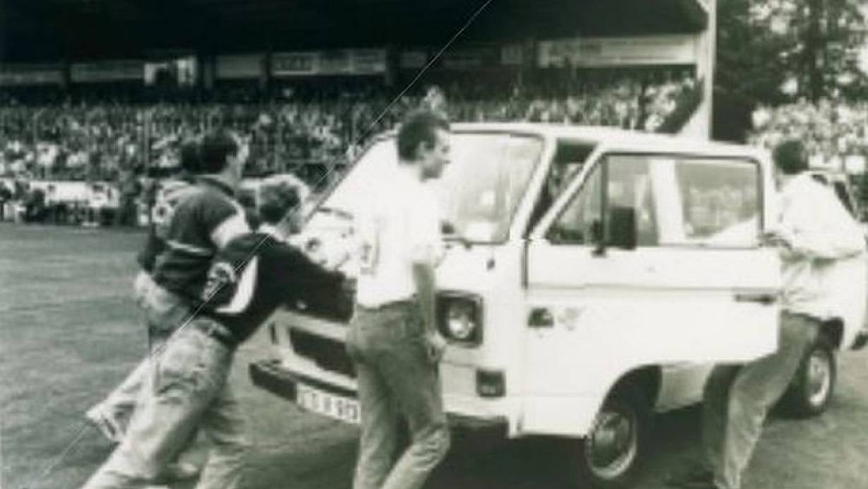 Wieso mussten Spieler des VfB Stuttgart 1989 beim Pokalspiel in Gütersloh dabei helfen, einen VW Bulli vom Spielfeld zu bekommen damit das Spiel angepfiffen werde konnte?!
