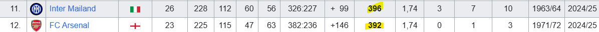 wie auch immer bei wiki ist Ajax in der Champions League auf Platz 10 und Inter auf Platz 11. Allerdings ist die Tabelle vom Stand Mai 2025. Ajax hatte da 4 Punkte vorsprung auf Inter. Die hat Inter jetzt aufgeholt.