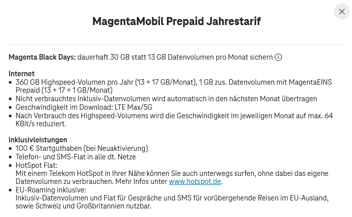 Ab morgen bei der Telekom: 360GB jährlich (30GB im Monat) Prepaid mit 5G bei 300 Mbit mit T-Phone 3 für 102€ für ein Jahr! Magenta Moments inklusive.