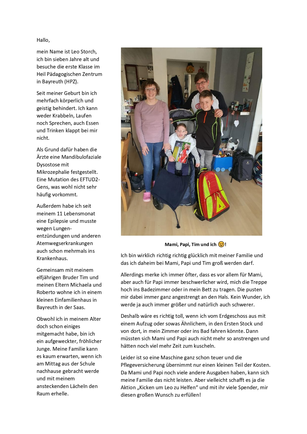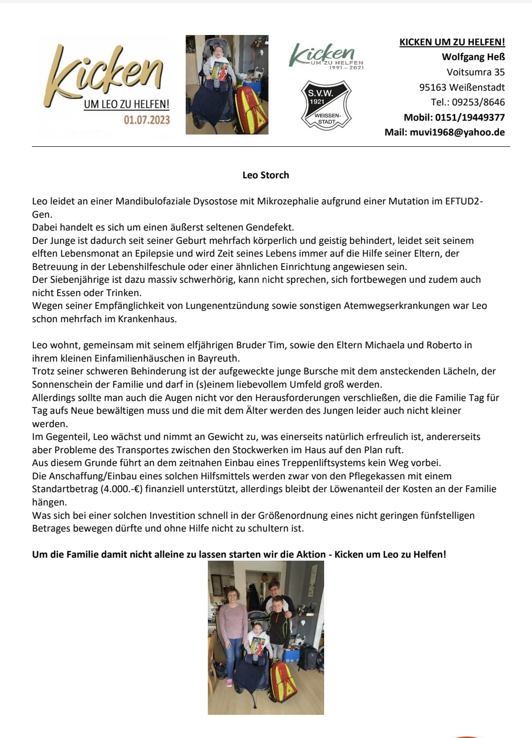 ein Fanclubkollege ist einer der Hauptorganisatoren für die Aktion "Kicken um Leo zu helfen". Hier sind verschiedene Aktionen geplant, um den kleinen Leo und dessen Eltern für die Beschaffung eines Treppenliftsystems behilflich zu sein bzw. finanziell zu unterstützen. Hauptact ist hier ein Fußballspiel ehemaliger Sportgrößen (u.a. Pierre Littbarski, Klaus Augenthaler uvm., Schiri: Deniz Aytekin) gegen eine lokale Promiauswahl.