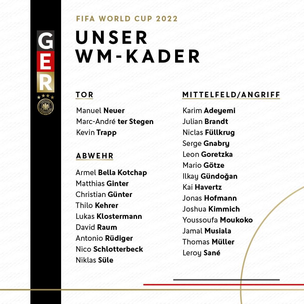 Mittelfeld/Angriff: Joshua Kimmich, Leon Goretzka, Jamal Musiala, Serge Gnabry, Leroy Sané, Thomas Müller (alle FC Bayern), Ilkay Gündogan (Manchester City), Jonas Hofmann (Borussia Mönchengladbach), Mario Götze (Eintracht Frankfurt), Julian Brandt (Borussia Dortmund), Kai Havertz (FC Chelsea), Karim Adeyemi (Borussia Dortmund), Niclas Füllkrug (Werder Bremen), Youssoufa Moukoko (Borussia Dortmund)