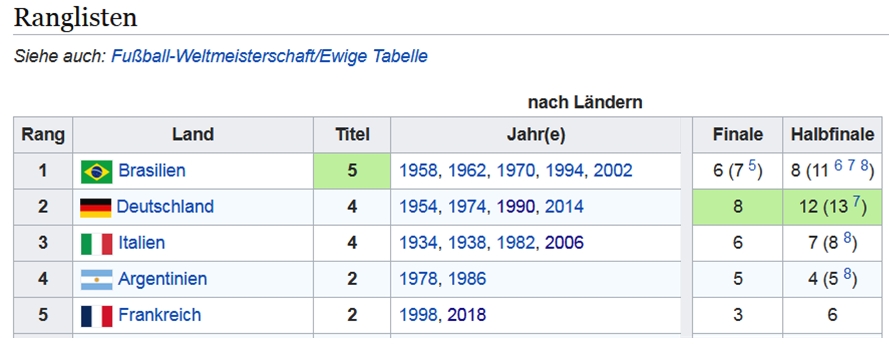 7 Bei der WM 1974 gab es kein eigentliches Halbfinale, die abschließenden Zwischenrundenspiele zwischen Deutschland und Polen sowie Brasilien und den Niederlanden entschieden aber über den Einzug ins Finale und werden vielfach als Halbfinalspiele angesehen.