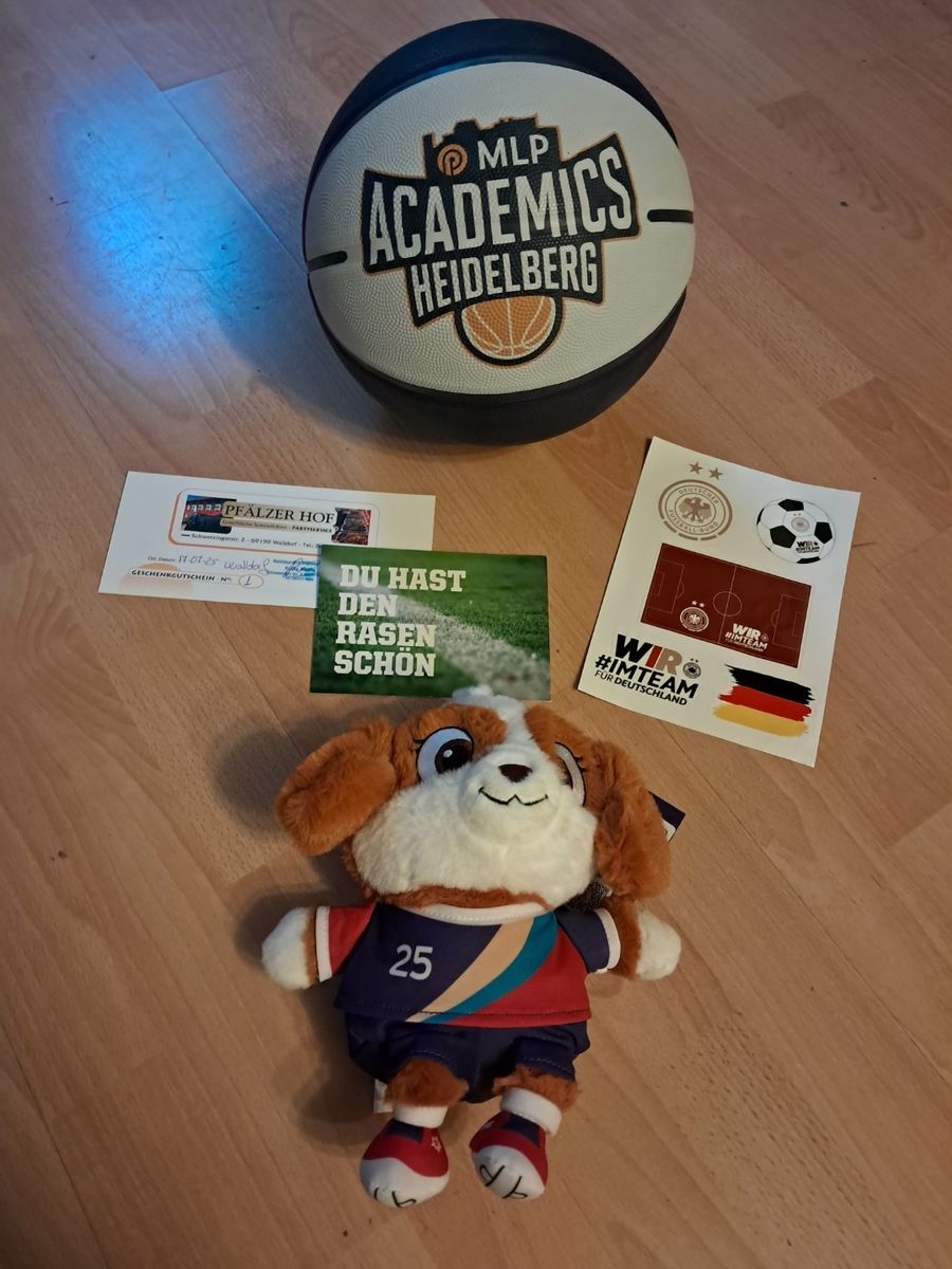 Somit habe ich heute von Tooor ein Plüsch Maddli direkt aus der Schweiz bekommen, aber das war nicht genug. Es haben so viele Tooorler zusammengelegt (Namen folgen), dass Manfred ( leloup ) zusätzlich noch ein Deutschland Sticker Set, einen Basketball meines Heidelberger Teams, einen Gutschein für mein Lieblingsrestaurant hier in Walldorf, sowie eine Karte mit Unterschriften aller Tooorler, die Teil der Uschi EM Gruppe sind (teilweise direkt in CH unterschrieben), dazu gepackt hat. Fotos siehe Anhang.