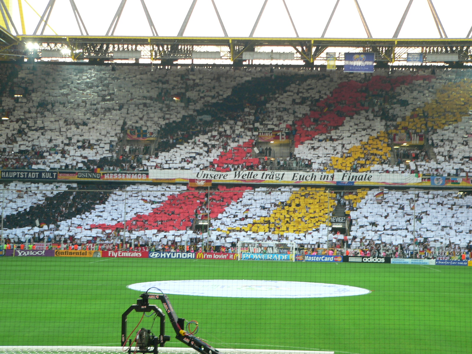 Finde es Wahnsinn was die Deutsche Elf während der WM alles bewegt und erreicht hat die ganze Stimmung im Lande usw.Muß sagen das die Stimmung schon sehr gut war war im Block 74 auf der Nordtribüne wir waren eigentlich die meiste Zeit gestanden und die Ecke neben mir gab gut gas.