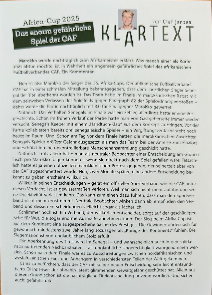 Senegal hat das Spiel sportlich gewonnen. Für die Aktion gehört man trotzdem bestraft. Aus meiner Sicht würde es ein ordentlicher Punktabzug in der nächsten Quali tun. Wenn der Titel aberkannt wird, dann ist das so...