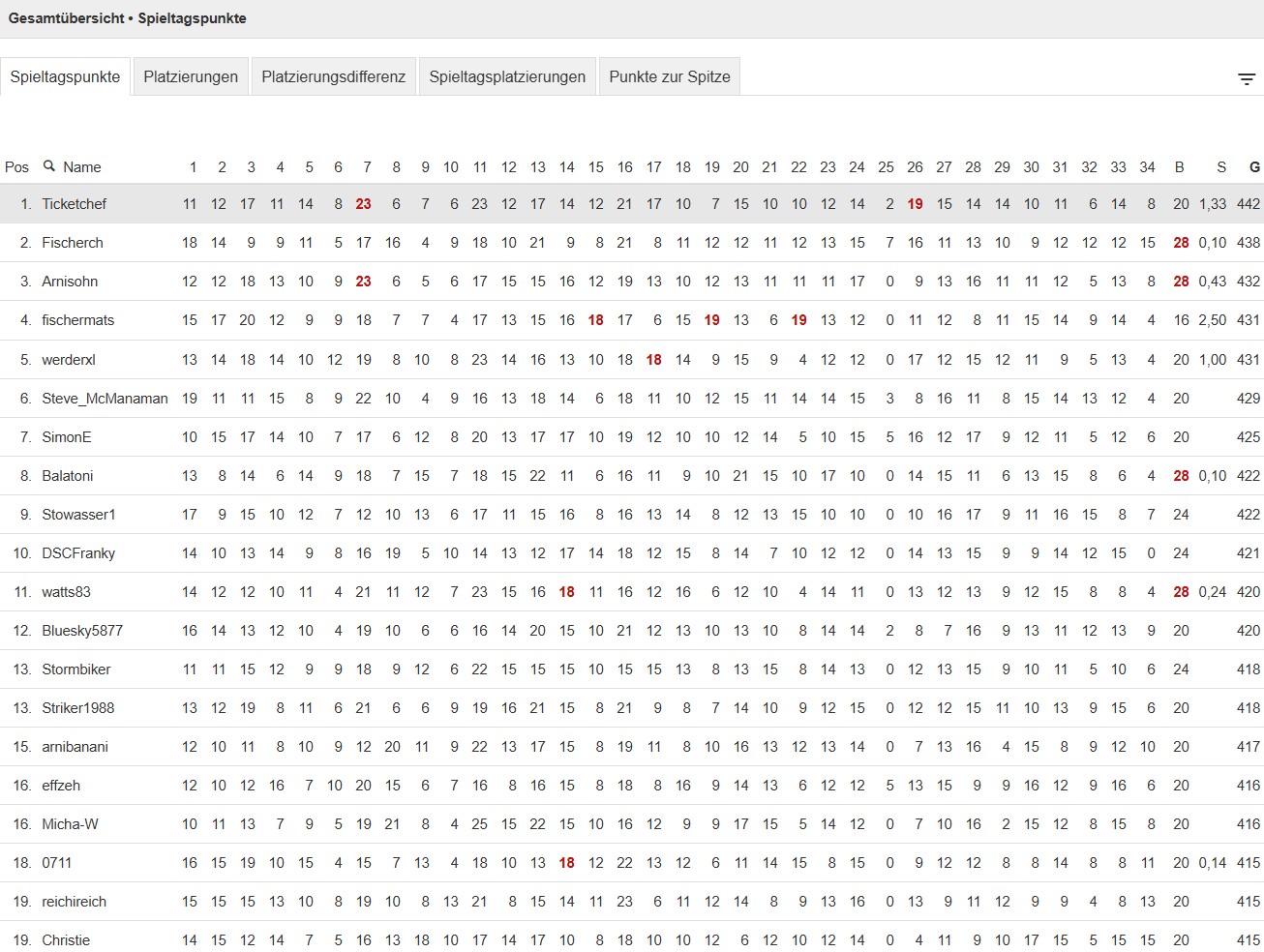 Wenn man das nochmal sieht war Spieltag 25 wild - fast keiner macht Punkte. Ich freue mich über den zweiten Titel :pokal::pokal:und finde ihn trotz 8 Punkten weniger Bonus und der Dauer des Spitzenplatzes zum Saisonende dann schon etwas verdient :mrgreen: