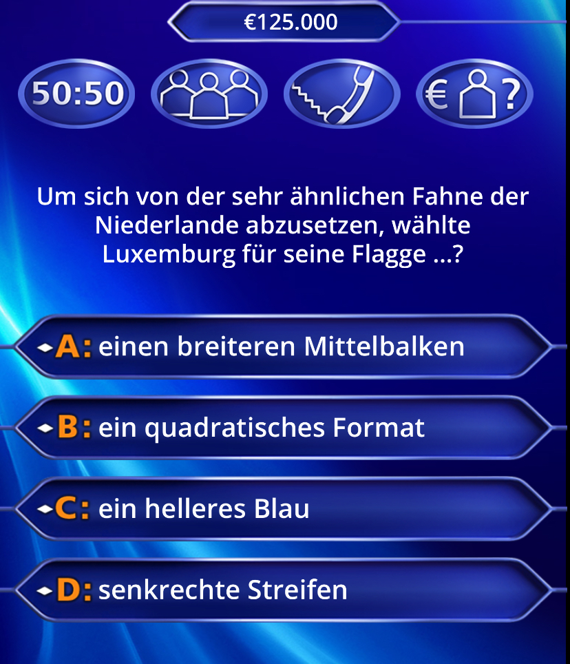 Da gebe ich dir recht. Selbst die EM-Frage von gestern ist für jemanden, der sich null für Sport interessiert absolut tödlich, finde ich.