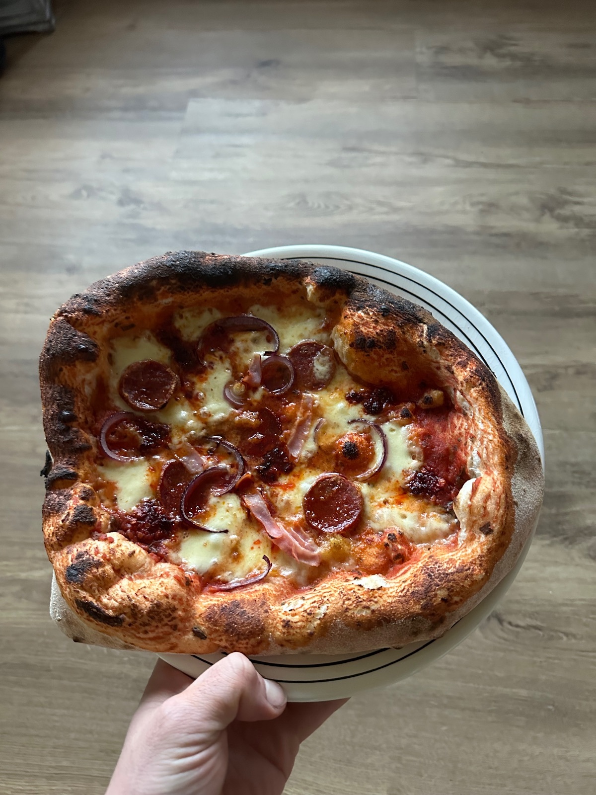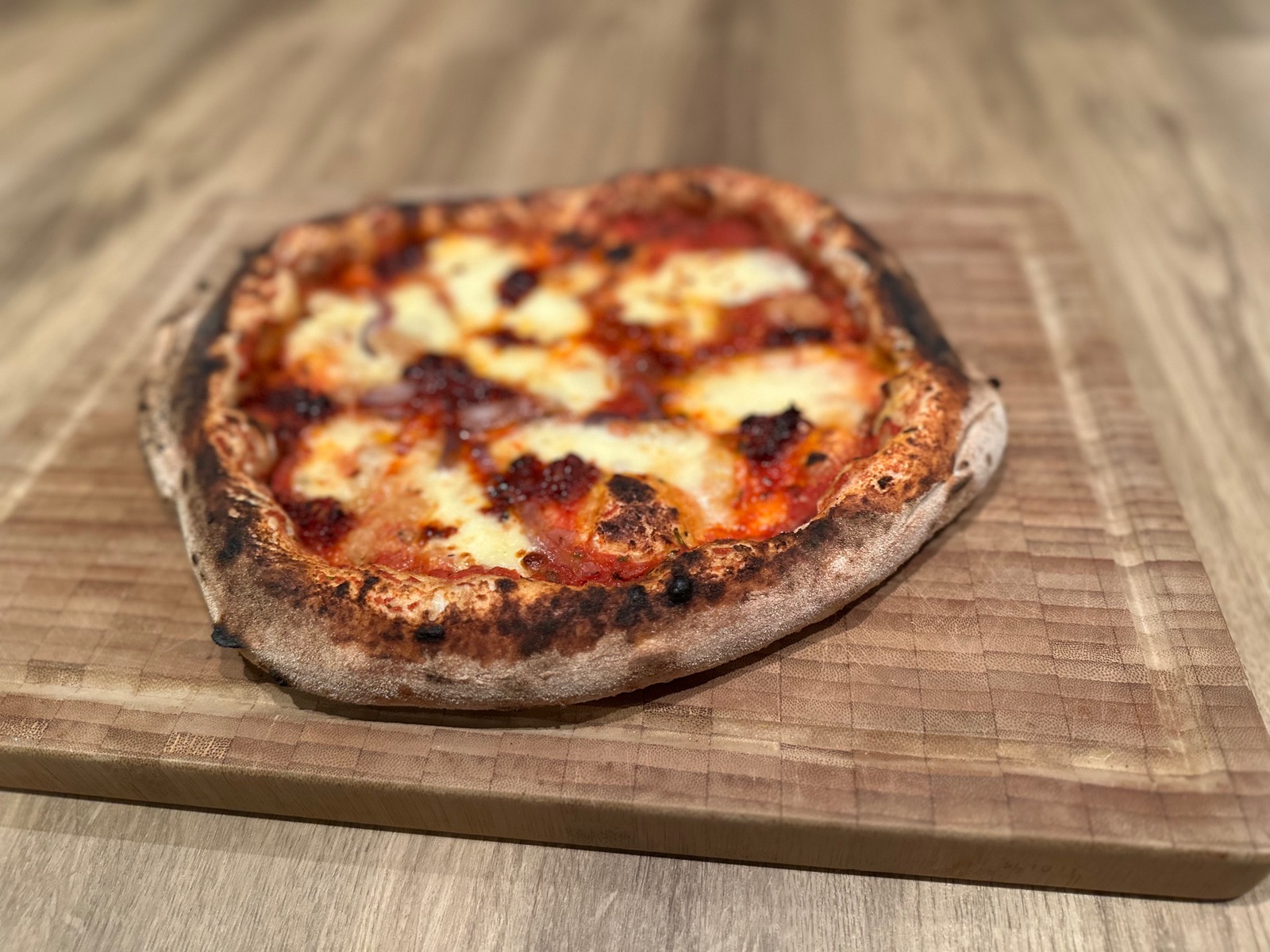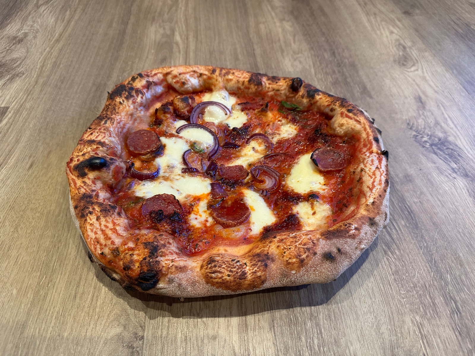Zur Erklärung Pizza ist 72 Stunden Teiggare mit Biga Vorteig + darauf ist Fior di Latte und Nduja Calabrese
