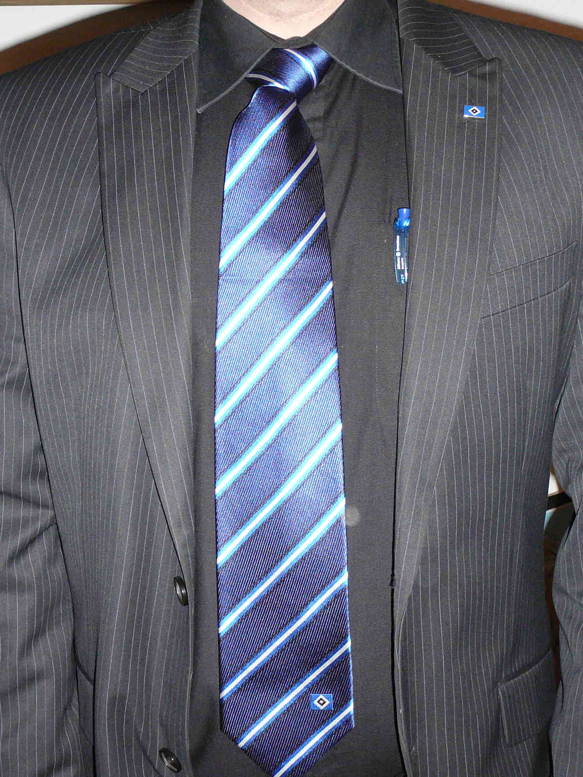 mit stolzer hsv-krawatte und kleinen pin sitze ich am arbeitsplatz ...