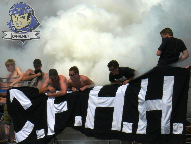 gleich am anfang merkte man halt das die kieler mit austragung eines fußball events doch etwas üverfordert sind.... nachdem es im hsv block ein paar bengalos gab und diese auf den rasen geworfen wurden bemerkten die schlauen ordner das es nicht sinnvoll ist diese zwecks löschen in einen plastik eimer zu werfen .... ![]()
