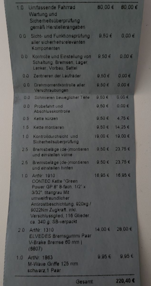 Habe die Tage mein Trekking Fahrrad (vergleichbar mit Giant Tourer GTS) , mit dem ich im Alltag in der Stadt Unterwegs bin zur Fahrradwerkstatt gebracht. Fahrrad hatte hier und da schon gewisse Verschleißerscheinungen. Dennoch kommt mir die Rechnung über 220,40€ (siehe unten) doch recht hoch vor. Sind die Preise in der Höhe gerechtfertigt oder wurde ich da ziemlich abgezockt? Bitte um eine kurze Einschätzung. Vielleicht haben wir hier ja den ein oder anderen Fahrradexperten. Danke!
