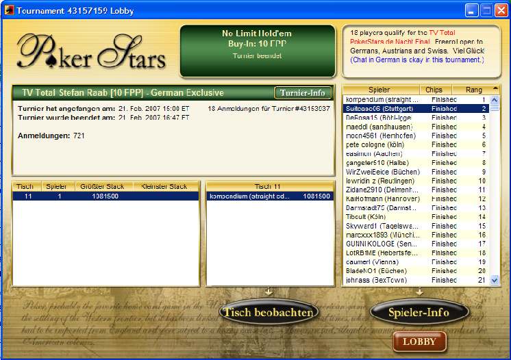geil, spiel grad das kleine Raab Turnier, noch 110 von 721 drin und ich bin Chipleader :mrgreen: