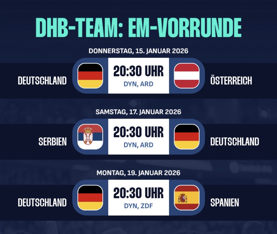 Die Handball EM beginnt am Do., 15.01.2026 und endet mit dem Finale am So., 01.02.2026. Gastgeber sind Dänemark, Schweden und Norwegen. Titelverteidiger ist Frankreich, das 2024 in Köln nach Verlängerung die Dänen bezwang. Deutschland konnte die EM das letzte mal 2016 gewinnen, was gleichzeitig auch der bisher letzte große Titelgewinn für das deutsche Team war. Topfavorit bei dem Turnier ist Co-Gastgeber Dänemark.
