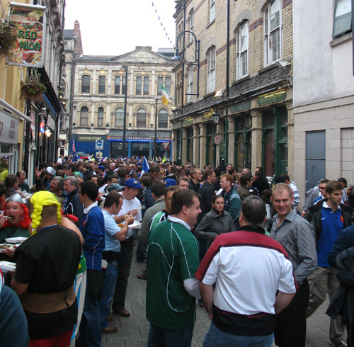 Das Stadion steht ja direkt in der City. An Rugbyspieltagen ist die ganze City ein einziger großer Biergarten. Während AUS-ENG waren die Pubs logischerweise brechend voll. Danach sind alle auf die Straßen und die Franzosen haben ne richtig nette Stimmung verbreitet. Nach ner Weile kickte auf der Mary St. der erste nen Ball in die Luft und für ne knappe Stunde rannte die eine Hälfte hin und her um das Ding zu erwischen und die andere Hälfte versuchte ihm auszuweichen. Am Ende müssen alleine auf dem Dach einer Bank ein halbes Dutzend Bälle gelegen haben. Gab auch das eine oder andere (vollkommen regelkonforme) Gedränge um den Ball zu sehen und irgendein Typ im King Kong Kostüm war ziemlich verdutzt, als ihm mehrere All Blacks Fans mitten auf der Straße gezeigt haben, was ein richtiges Tackling ist.