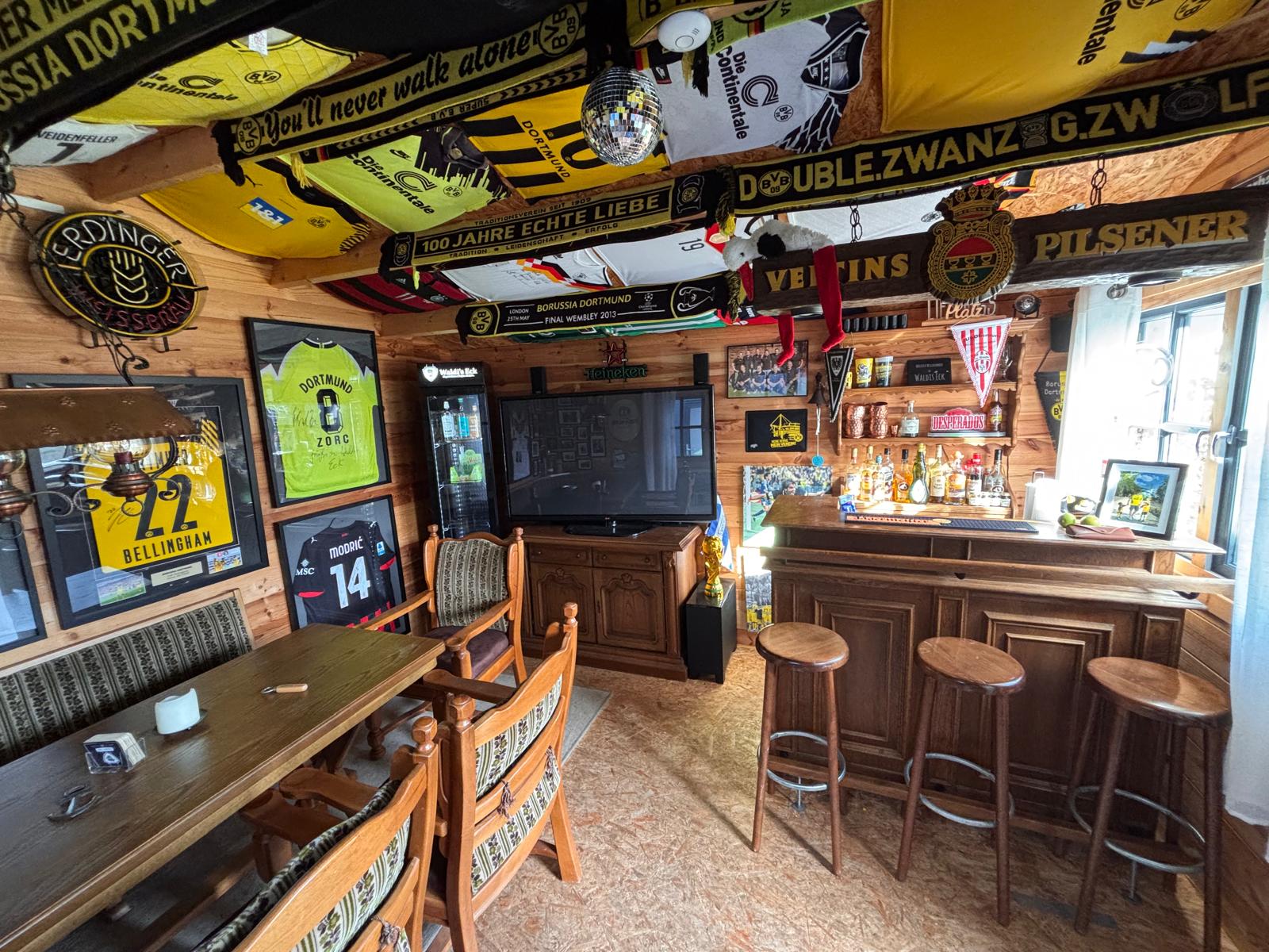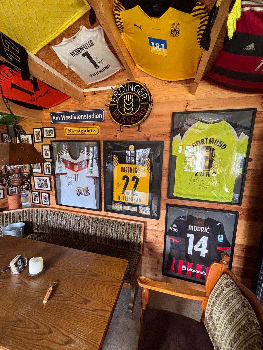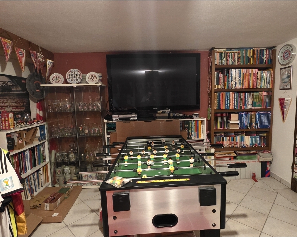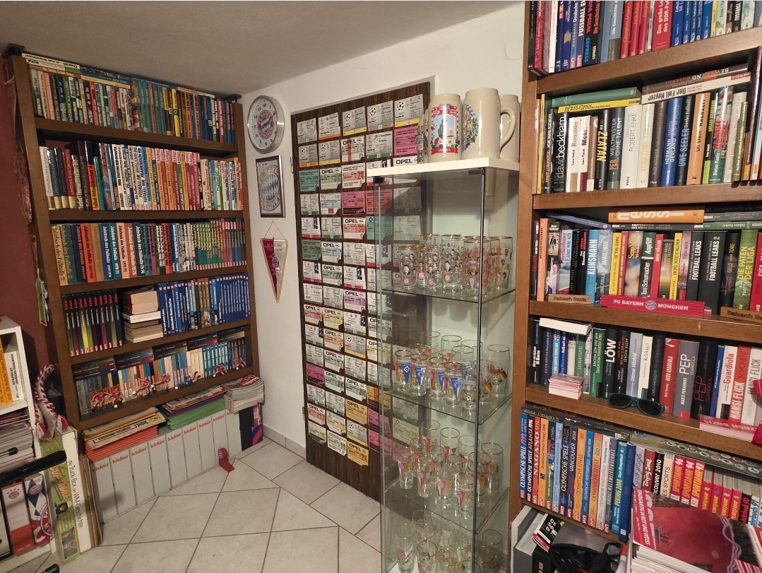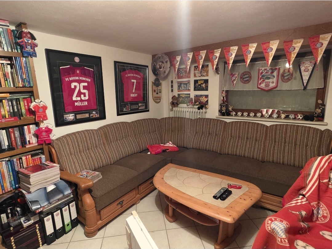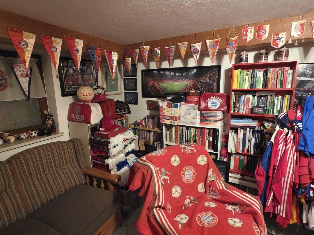 Ich habe mir im Keller ein FCB-Museum eingerichtet, in dem ich auch oft gemeinsam mit Spezln Fußball schaue. Mittlerweile geht mir etwas der Platz aus, diverse Trikotrahmen liegen noch verpackt herum, weil die Wände voll sind :huebscher: