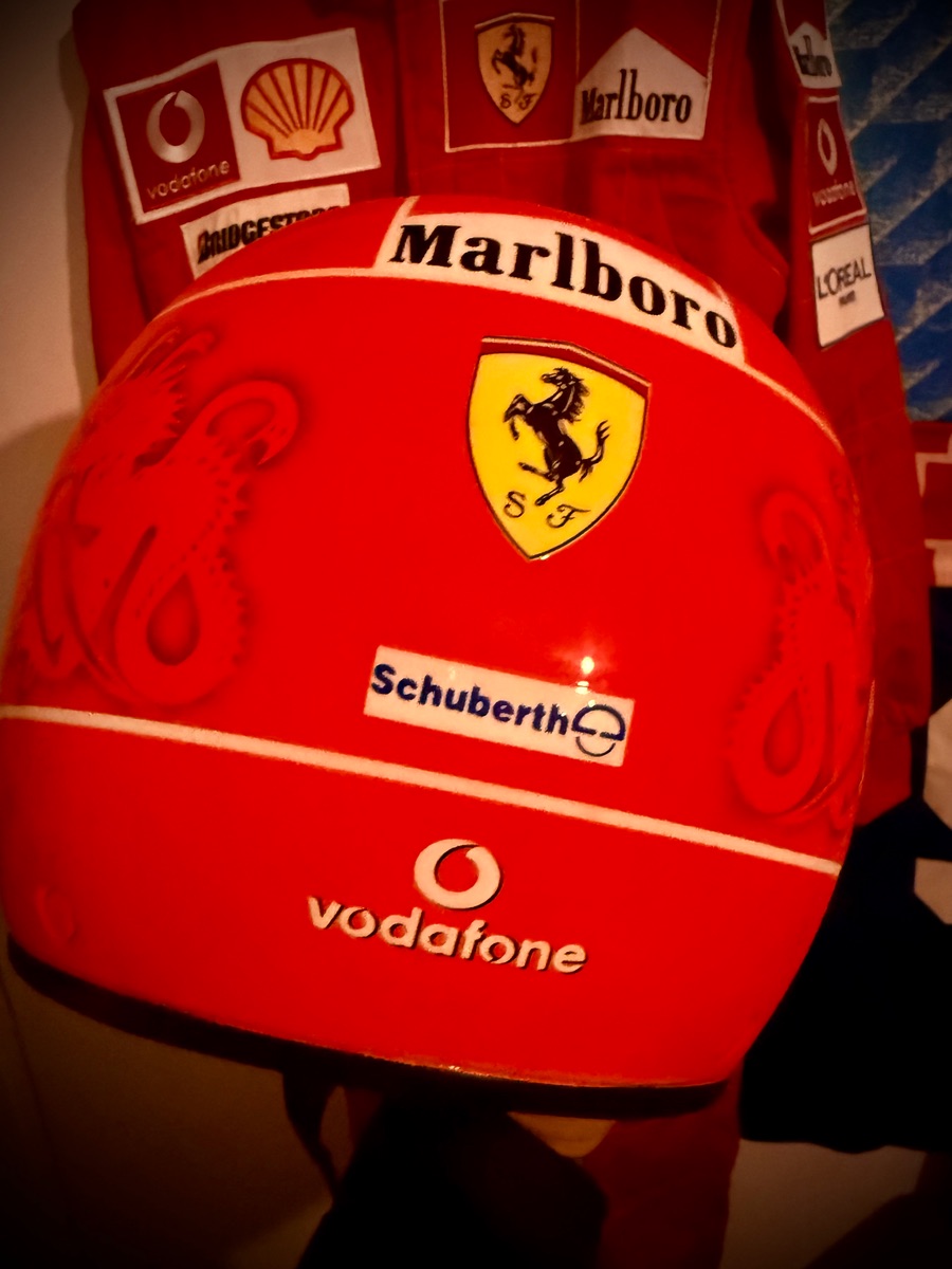 Original Schuberth-Helm, der von einem Liebhaber 1:1 mit dem 2006er-Design von Schumi lackiert wurde. Zusammen mit dem Anzug aus Pakistan nimmt das Ziel einer lebensgroßen Schumi-“Schaufensterpuppe” weiter Formen an, die beiden wichtigsten Sachen sind damit endlich beisammen.