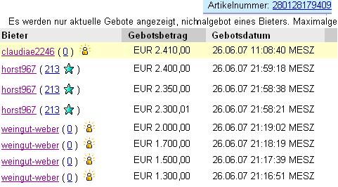 Ich nenn ja keine Namen, aber der hat heut 8 Auktionen beendet, und alle selbst ersteigert (Wert ca. 14800EUR) , hab ihn daraufhin darauf hingewiesen, dass er damit nur ebay glücklich macht, jetzt will er mich gleich wegen Verleumdung verklagen.