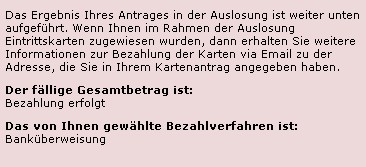 Das Ergebnis Ihres Antrages in der Auslosung ist weiter unten aufgeführt. Wenn Ihnen im Rahmen der Auslosung Eintrittskarten zugewiesen wurden, dann erhalten Sie weitere Informationen zur Bezahlung der Karten via Email zu der Adresse, die Sie in Ihrem Kartenantrag angegeben haben.