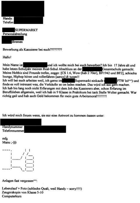 Die Bewerbung muss ich mir speichern. Das ist echt der Hammer. Sowas kann man doch nicht ernst meinen.