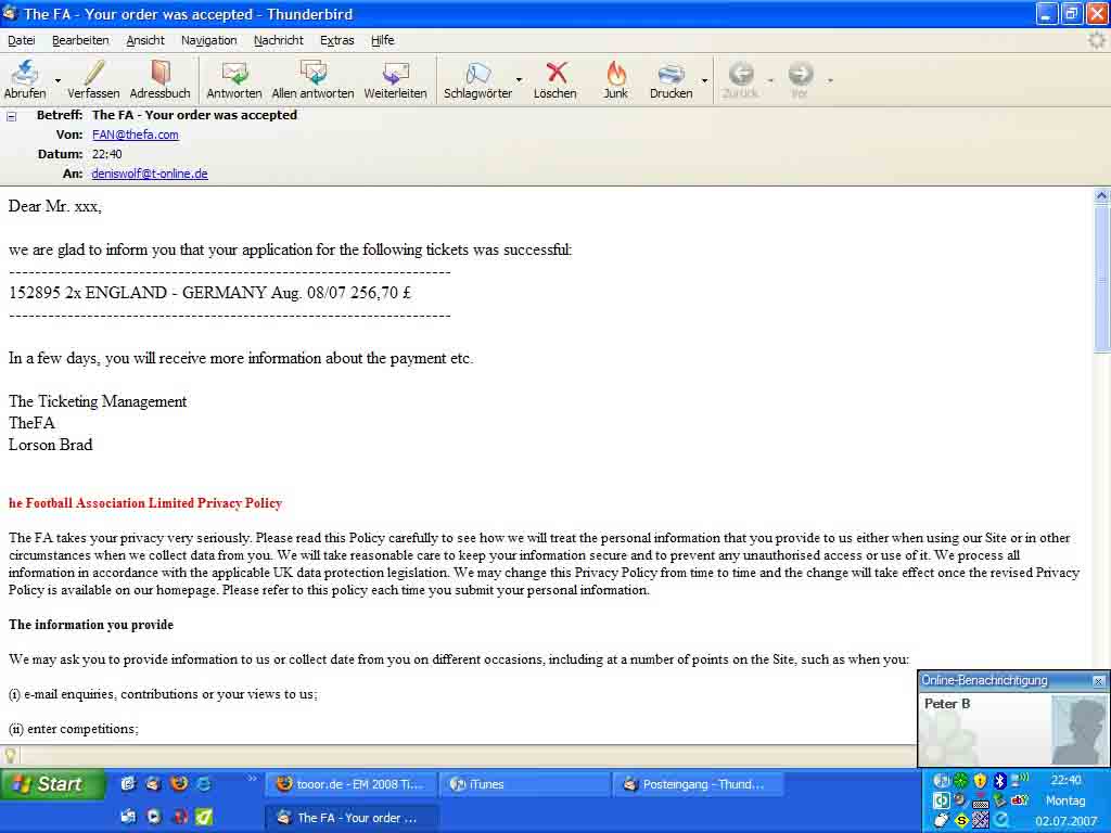 152895 2x ENGLAND - GERMANY Aug. 08/07 256,70 £