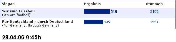 sag mal, hans! hast du es jetzt gepackt? auf der fifa seite wird der neue spruch für den bus präsentiert: "Für Deutschland - durch Deutschland" (oder umgekehrt, is ja auch egal)