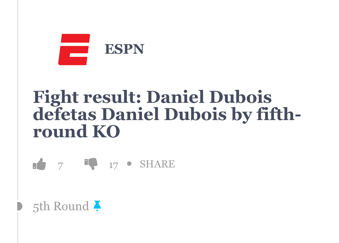 Was für ein Kampf, was für ein Comeback von Usyk. Fury hatte ihn mit seiner Größe echt im Griff, aber diese eine Kombination mit der Nase (gebrochen?) hatte Fury am Sack. Dass Fury nach dem Schlaghagel in Runde 9 - der war doch bewusstlos quasi - noch stehen bleibt, ist auch unfassbar. Absolut epischer Kampf. Dankbar, das gesehen zu haben. Wäre nur zu schön, dass Ding in London live zu sehen.